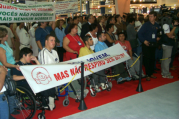 São Paulo - apesar de já estar para completar 2 anos a portaria do Ministério da Saúde garantindo a assistência ventilatória não saiu do papel; na quase totalidade do Brasil ela é desconhecida. Em São Paulo somente com medidas judiciais a portaria tem sido cumprida. Revoltados com a demora nesta regulamentação em São Paulo os pais e portadores de distrofia muscular fizeram no dia 10 de junho uma significativa manifestação na inauguração da Hospitalar/2003, feira de artigos hospitalares. Na presença do Ministro da Saúde e do Governador de São Paulo e de órgãos de imprensa os bravos representantes expuseram cartazes e manifestaram-se com ordem mas bastante ênfase a sua revolta e a necessidade de imediata implantação da portaria. Este seguramente será um marco na luta pelos direitos dos portadores de distrofia. Acredito que esta forma de luta deveria se repetir em outros estados com relação a esta portaria e com relação aos outros deveres que o Estado não tem cumprido, como a realização dos testes genéticos, a assistência médica e fisioterápica, as facilidades para locomoção e ensino, etc. Os resultados desta manifestação já foram sentidos no próprio dia e seguramente a implantação da assistência respiratória em São Paulo se fará com mais rapidez e melhor qualidade. Seguem as fotos desta manifestação enviadas por Andréia Bezerra de Albuquerque: